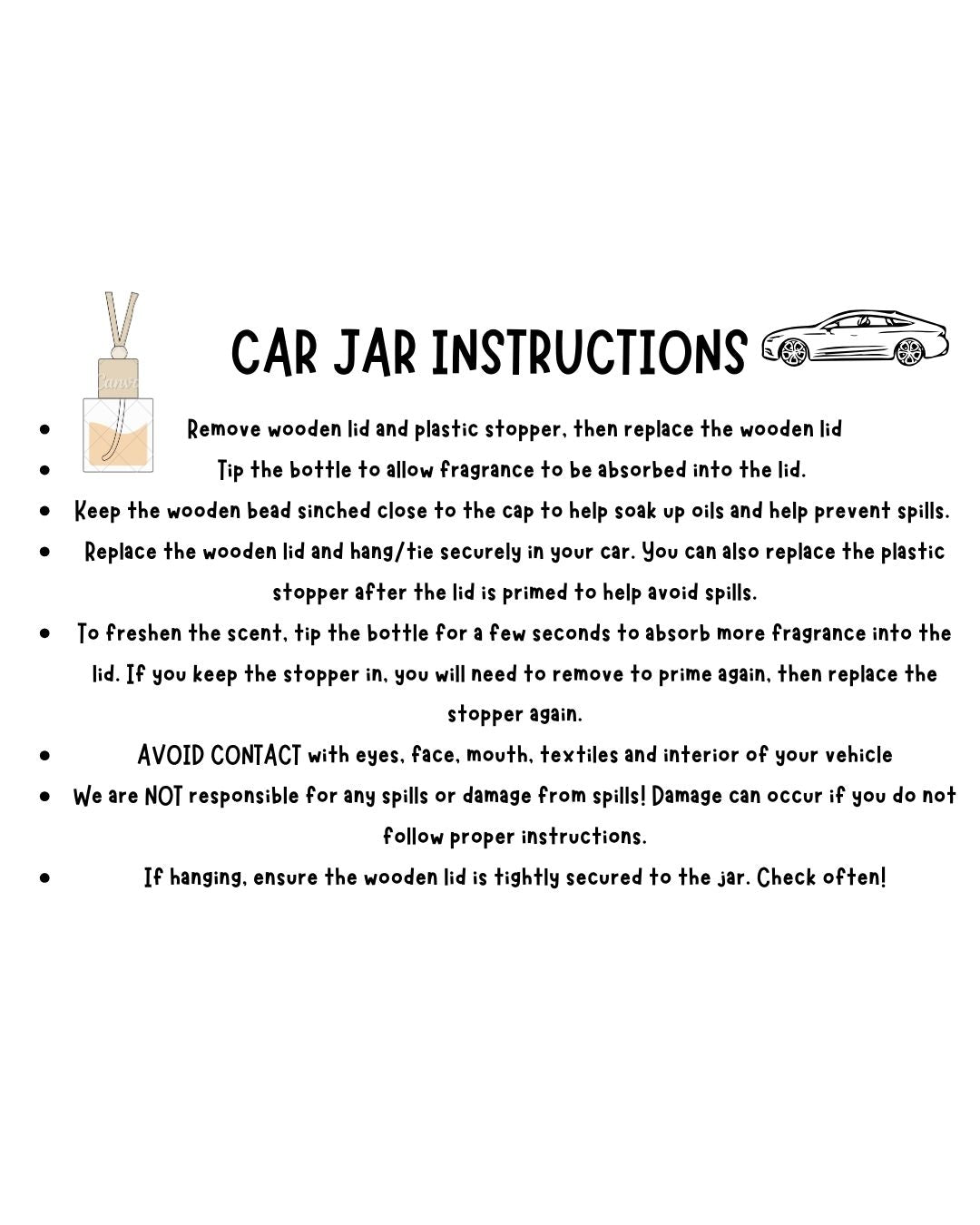 Car fresheners/Car Jar These little cuties last approximately 60 days in the winter & 30 in the summer. Phthalate Free These car jars will make your car smell fresh, plus they're absolutely adorable. Prior to use twist off the wood top, take out the plastic plug, twist the wood top back on, and hold the jar upside down for a few seconds to disperse the oils. The wood cap acts as the "wick" like reed diffusers. If you notice your jar not smelling, turn it upside down to saturate the wood cap. When you do this ensure your cap is still secure! The liquid and friction from movement can cause these to come loose, check often! To help reduce the chance of spills, prime the lid and replace the stopper. You will need to remove the stopper each time your lid needs primed. Damage can occur if you do not follow proper instructions.