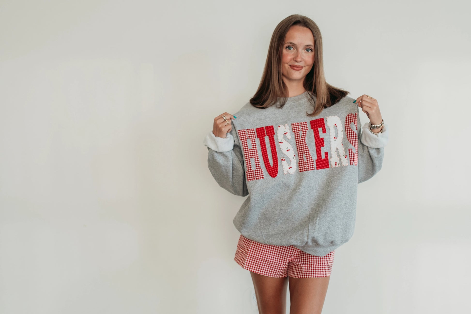 – Grey Crew Show off your Nebraska pride in style with our adorable Huskers Patchwork Crew! This premium crew features hand-sewn appliqué lettering in a cute red gingham, red cherries and red polka fabric! Unisex fit