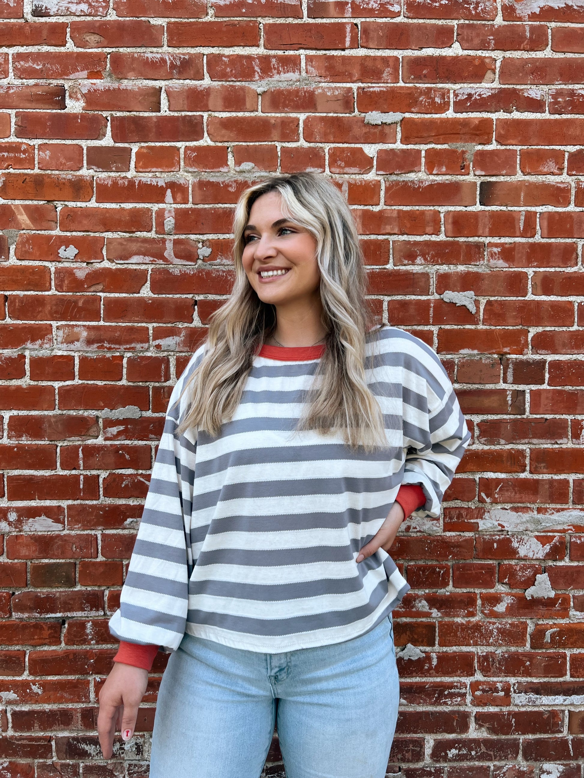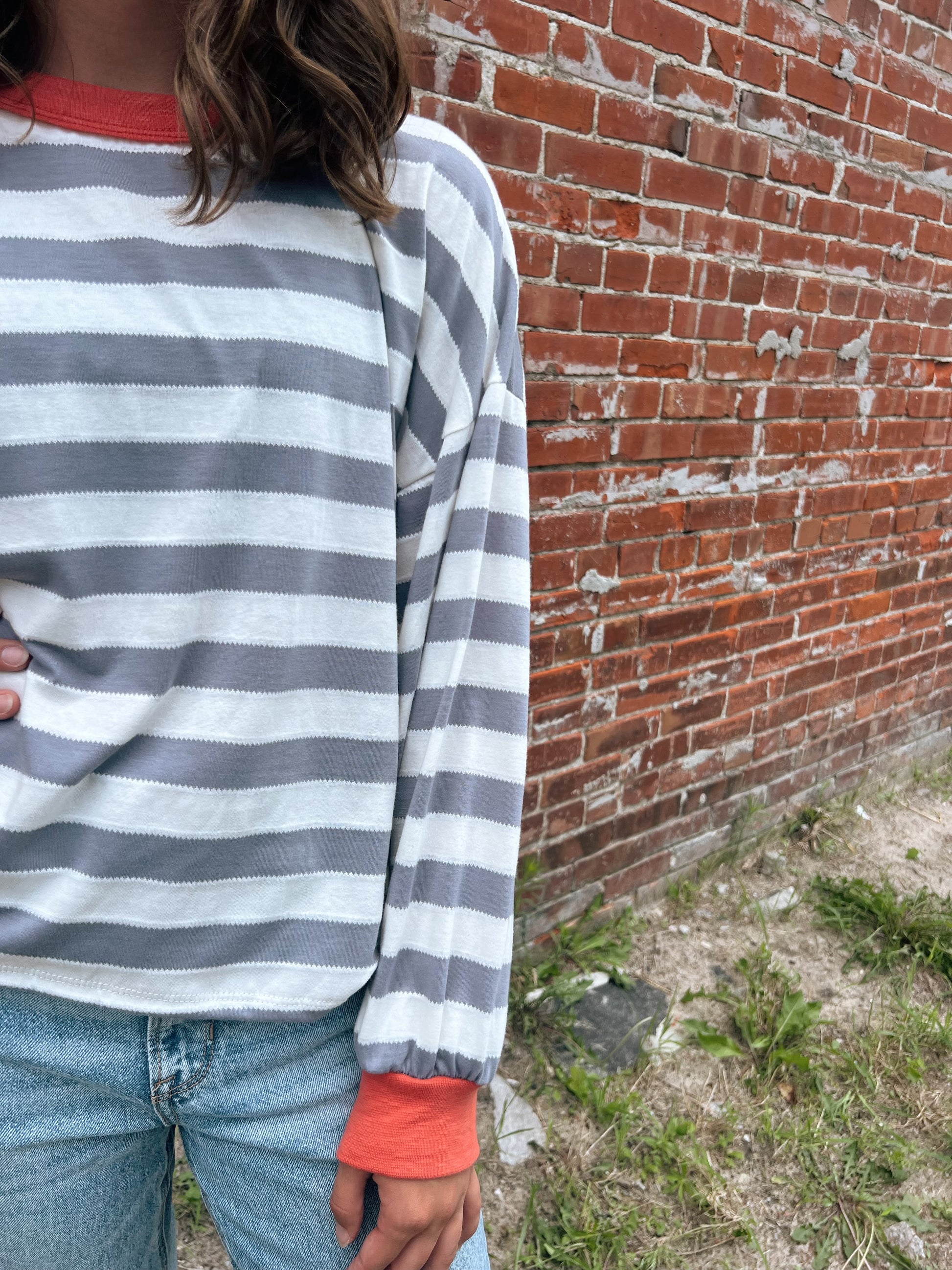 Stripe Print Sweatshirt Top - Boatneck - Long drop-shoulder sleeves - Loose fit